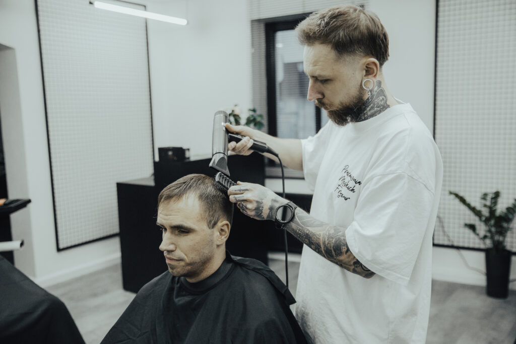 Zaczynamy od rozmowy – jaki masz styl, co Ci odpowiada, a czego masz dość. Potem precyzyjna robota maszynką i nożyczkami, odpowiednie przejścia, tekstura, objętość i wykończenie, które robi różnicę.